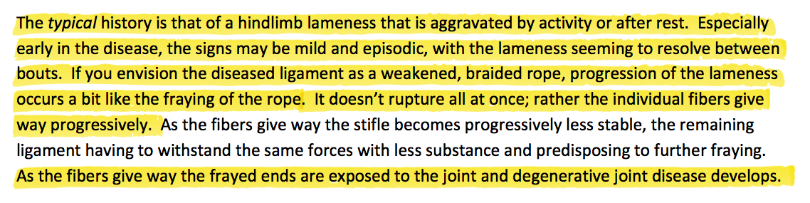 Intermittent/Progressive Hind Limb Lameness- Slow Degeneration of Ligament leads to Degenerative Joint Disease