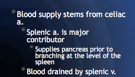 *Blood Supply comes from Celiac Artery. The Celiac Artery is going to Give off the Splenic Artery which will Supply the Pancreas prior to Branching and Feeding off a Branch to the Spleen