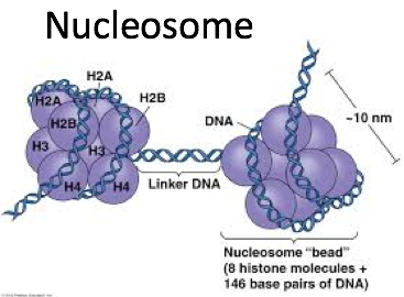 8 histone protein molecules + 146 bp of DNA, connected by linker DNA