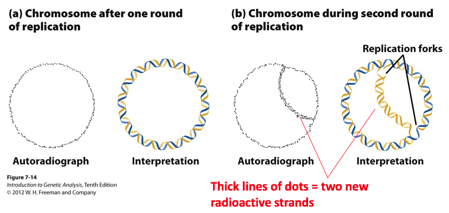 In his 1963 paper “The bacterial chromosome and its manner of replication as seen by autoradiography”, John Cairns demonstrated by autoradiography that the DNA of the bacterium Escherichia coli was a single molecule that is replicated at a moving locus (the replicating fork) at which both new DNA strands are being synthesized. Subsequently, it was found that there were in fact two moving forks, traveling simultaneously in opposite directions around the chromosome. He used a pyrimidine deoxynucleoside, thymidine, radioactively labelled with 3H. Intially grew cells in small amounts of 3H-thymidine, then breifly in large amounts of 3H-thymidine. A dense label at the replication fork as new DNA is made