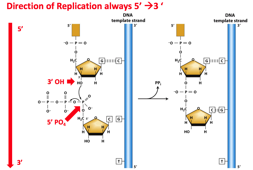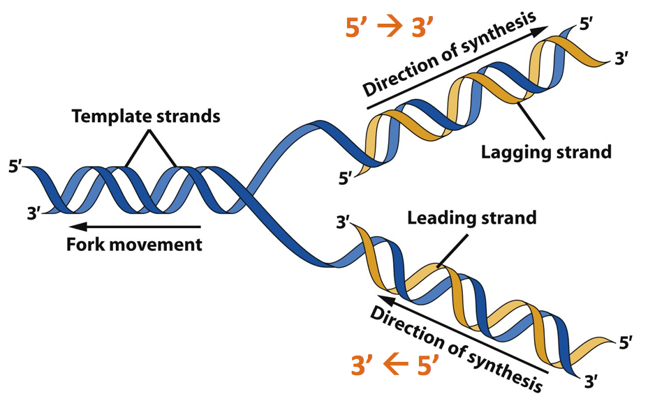 The leading strand has a parental 3’ end, while the lagging strand has a parental 5’ end. New dNTPs are always added from 5’ to 3’!
