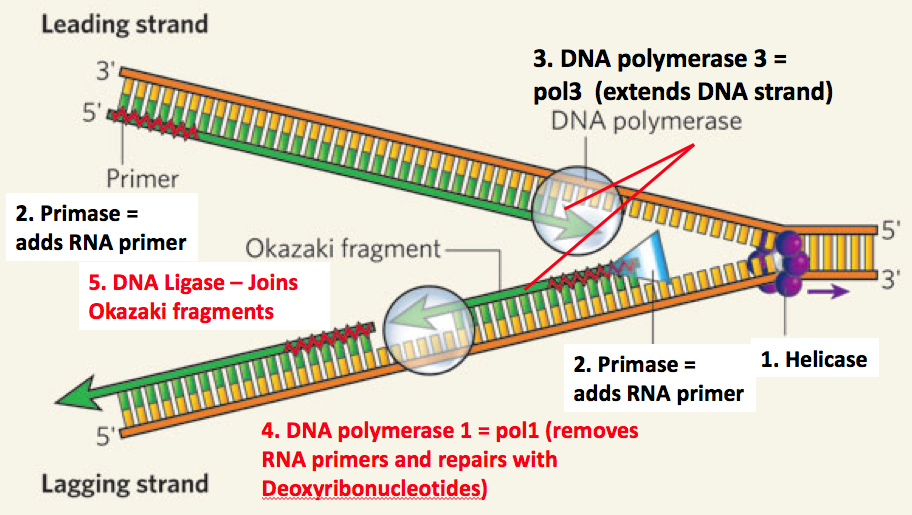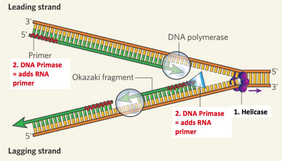 Places RNA primers (with a free 3’ OH) onto the “naked” template strand so that DNA polymerase III can add new dNTPs in the 3’ direction