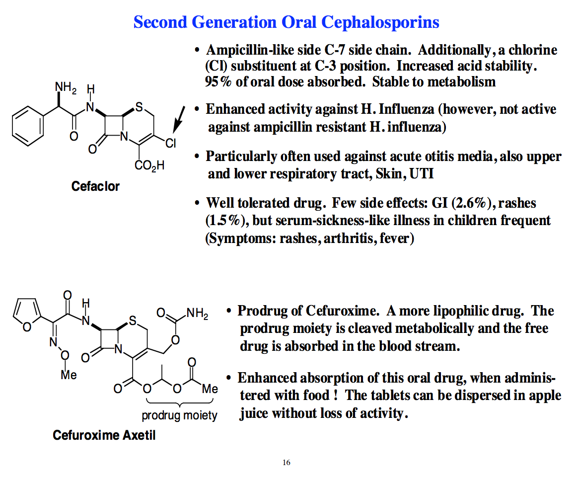 Prodrug of Cefuroxime. A more lipophilic drug. The prodrug moiety is cleaved metabolically and the free drug is absorbed in the blood stream._____