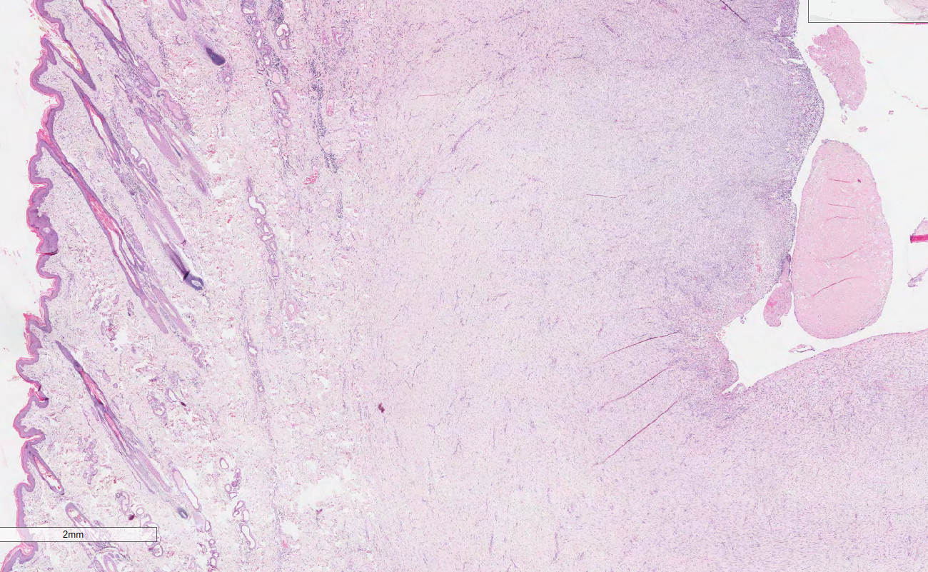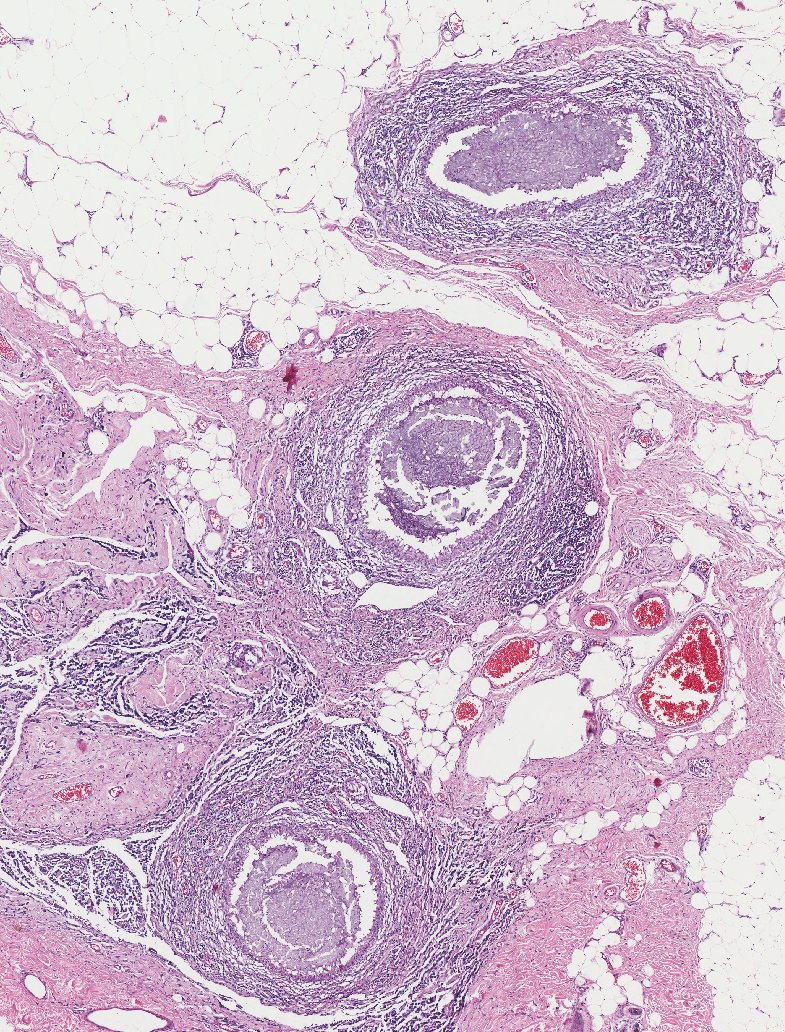 The three circular structures in the deep dermis and subcutis are most consistent with: