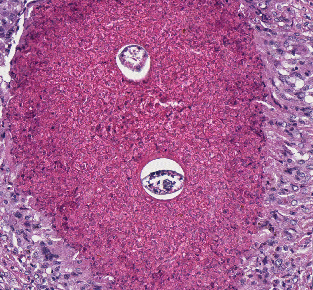 Central necrosis may be due to toxic molecule release by macrophages (e.g., superoxide anion and lysosomal enzymes) and hypoxemia. The necrosis may undergo secondary dystrophic calcification in some species to result in radiodense lesions that are readily detectable in radiographs.