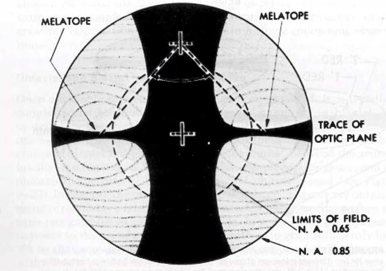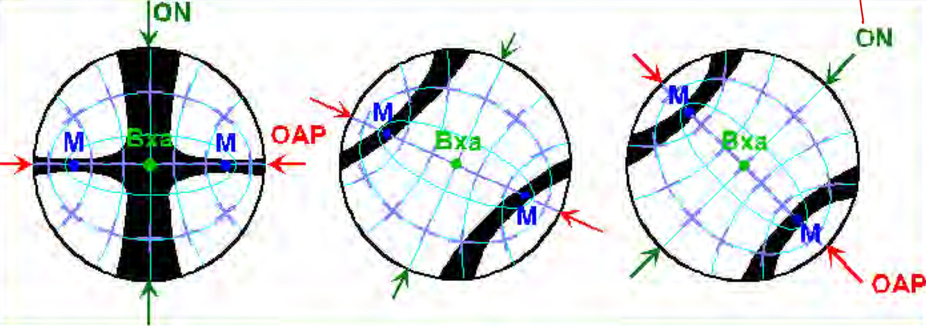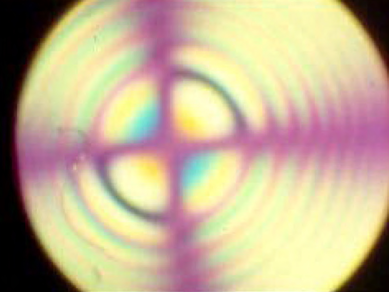 Contains isogyres (roman cross/points of extinction) that when rotated, the hyperbolas switch quadrants