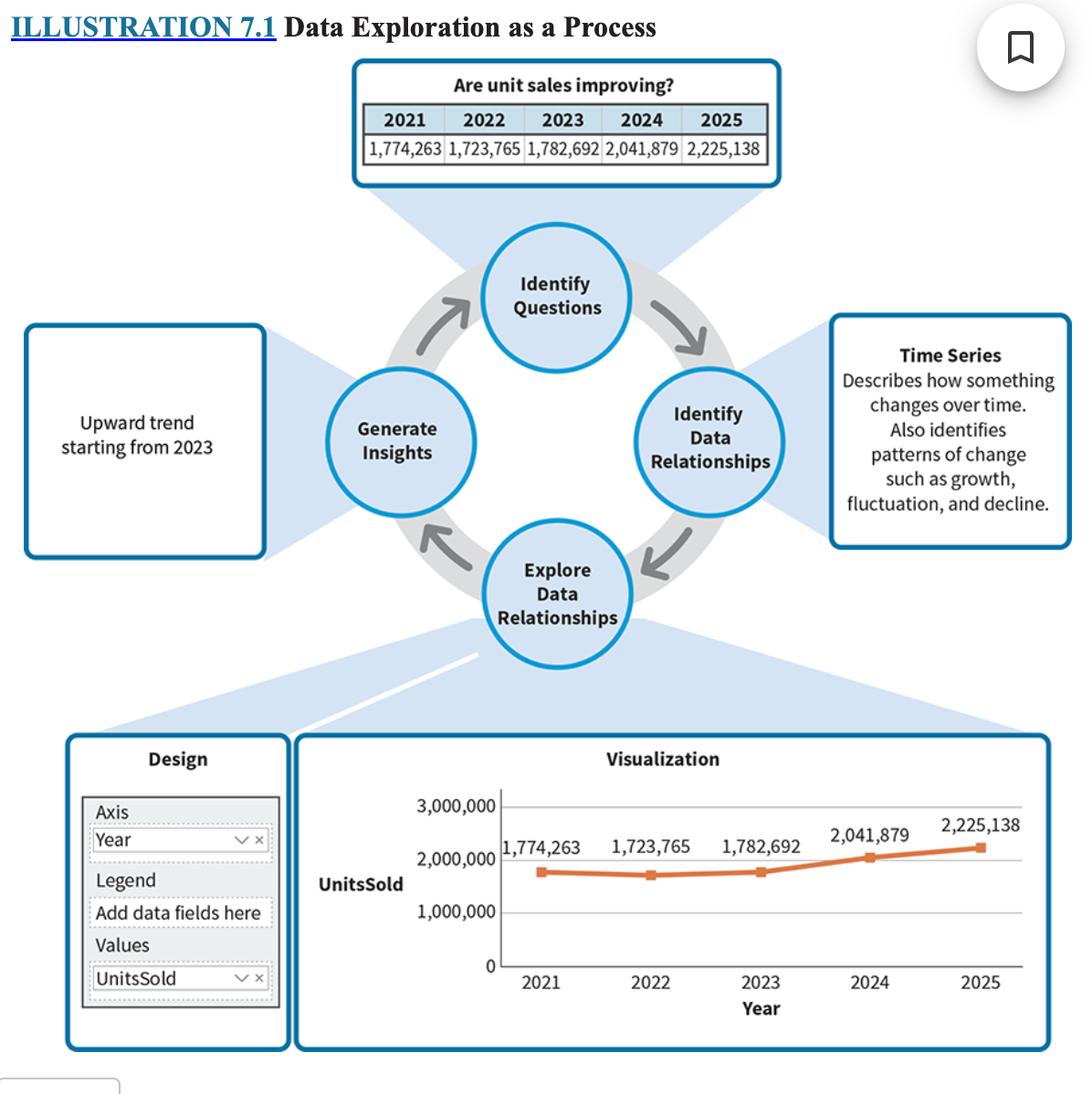 The line chart in Illustration 7.1 shows an upward trend of unit sales starting in 2023.