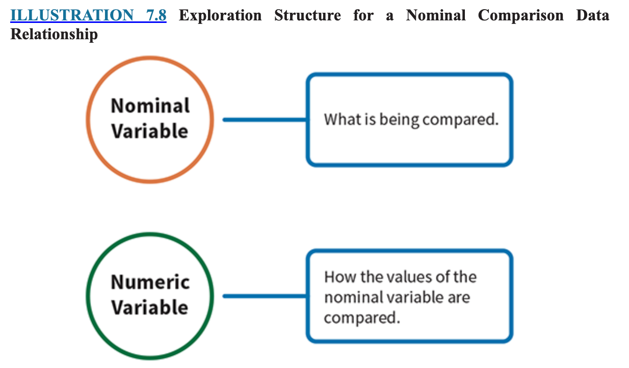 For nominal comparisons, the exploration structure is a 1) n___al variable, which is 2) w___ is being 3) com___, and a 4) nu____ variable, 5) w___ is 6) h__w the values of the 7) n__l variable are 8) co__d