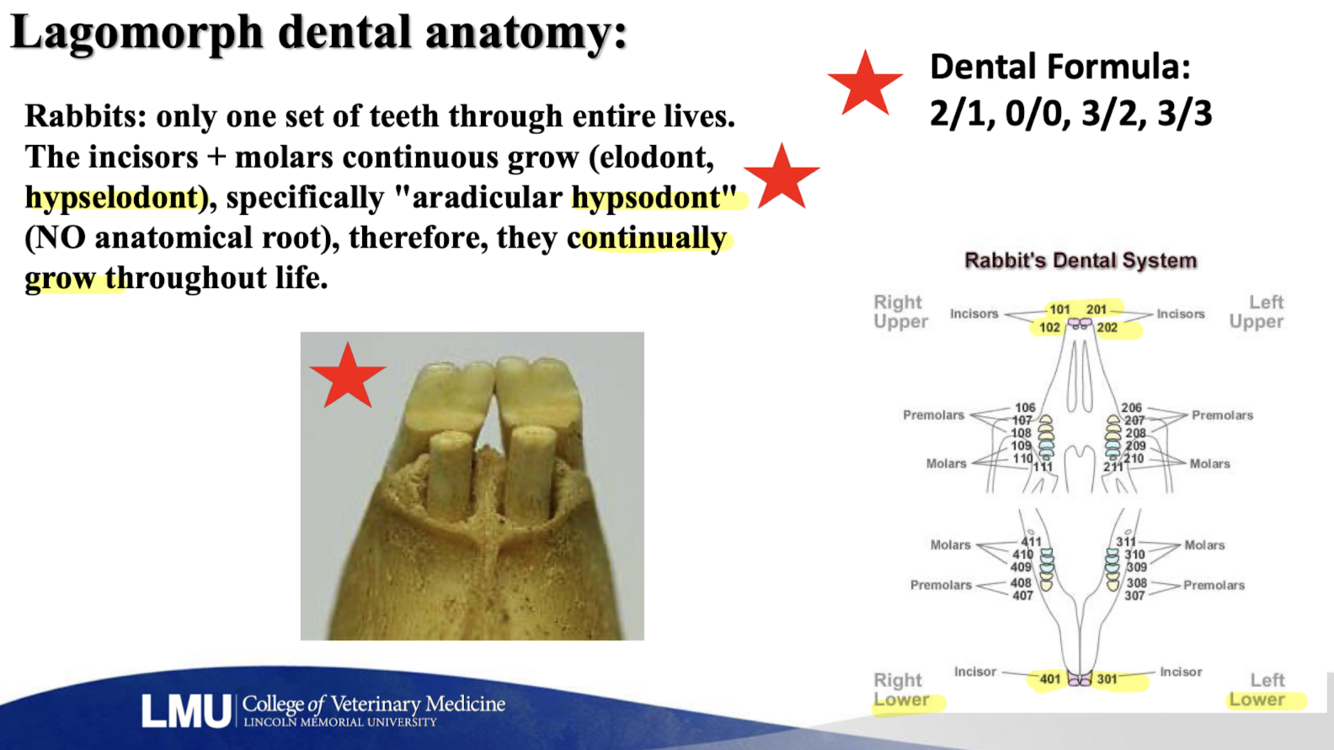 -Elodont & Hypselodont: only one set of teeth throughout their lives, incisors and molars continuous growth