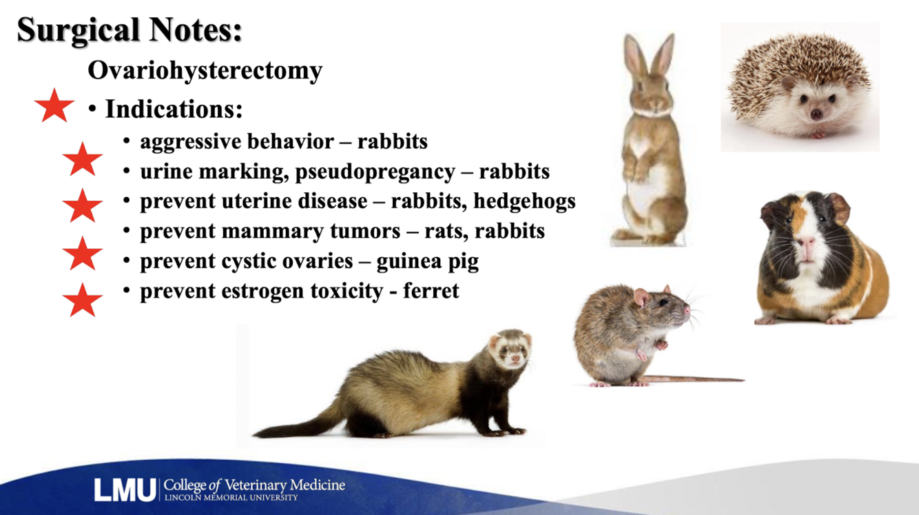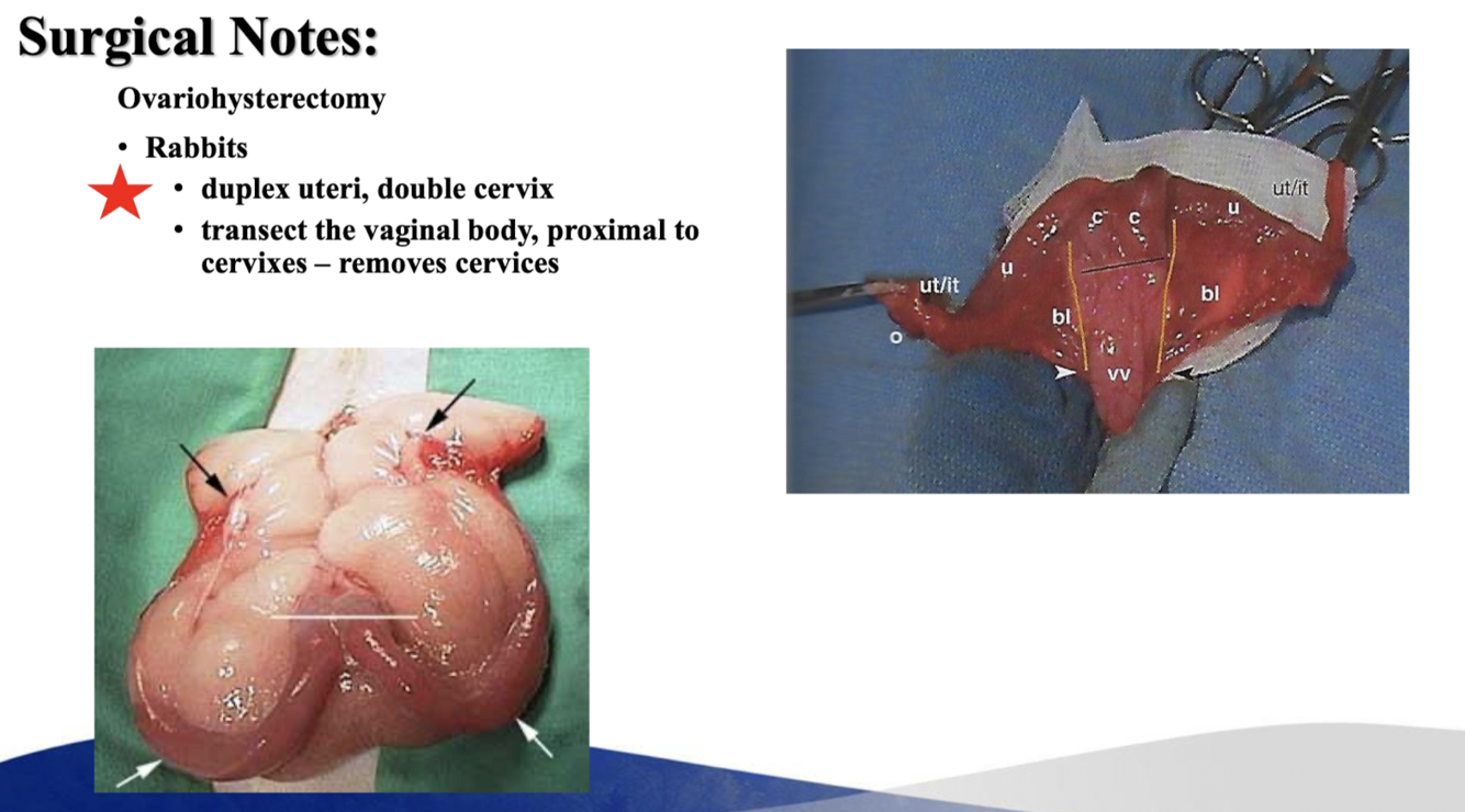 Compare the surgical anatomy of orchiectomy and ovariohysterectomy in the rabbit and common pet rodents