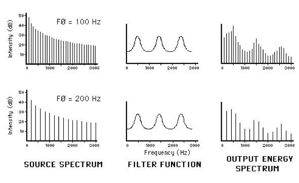 The vocal tract acts as an acoustic filter, which modifies the sound produced by a sound source (VF vibration, turbulent noise, or a combination of the two)