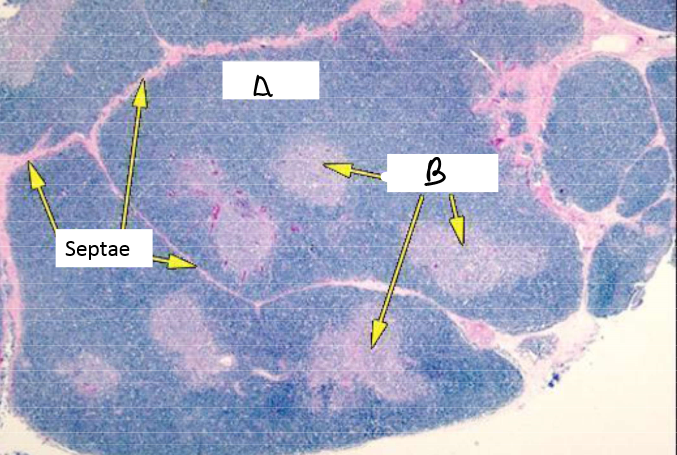 What lymphatic organ is this? What are the structures labled A and B? What is significant about both of these?