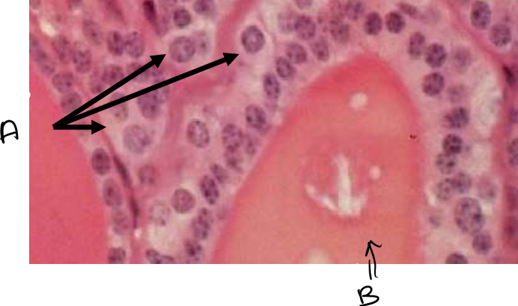 What is this endocrine organ? What are the arrows point to? What do they produce? Is B less active or more active follicle?