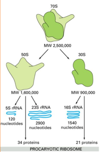 Prokaryotic, the 70S ribosome is made of the 50S (5S, 23S rRNA and 34 proteins) and the 30S (16S rRNA and 21 proteins)