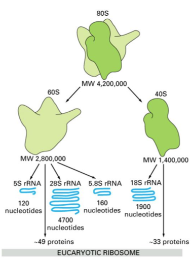 Eukaryotic, the 80S ribosome is made of the 60S (5S, 5.8S, 28S rRNA and ~49 proteins) and the 40S (18S rRNA and ~33 proteins)