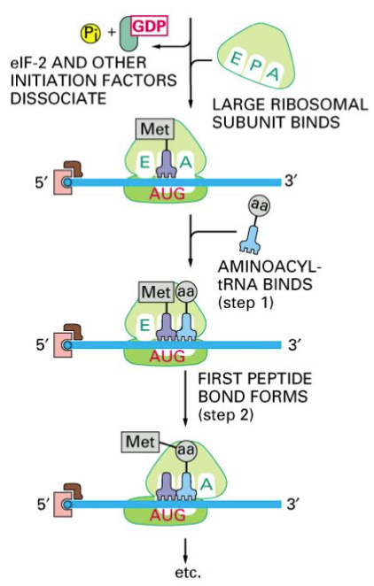 The large ribosomal subunit binds, and elongation begins