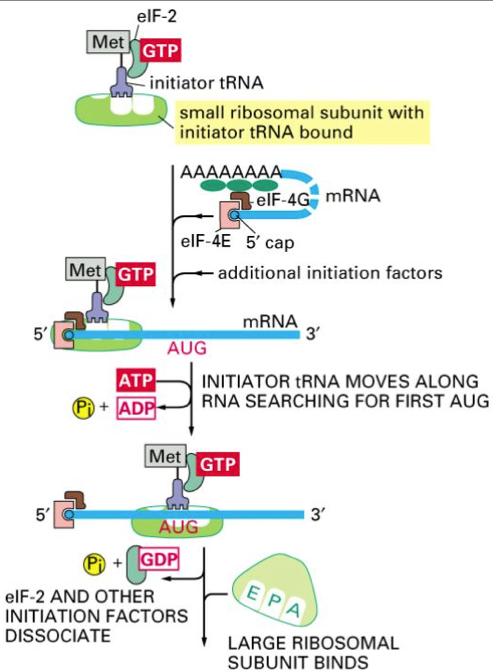 The small ribosomal subunit binds to the 5’ cap with the help of eIFs (eukaryotic initiation factors, forming the 40S initiation complex) and scans for the first AUG codon.