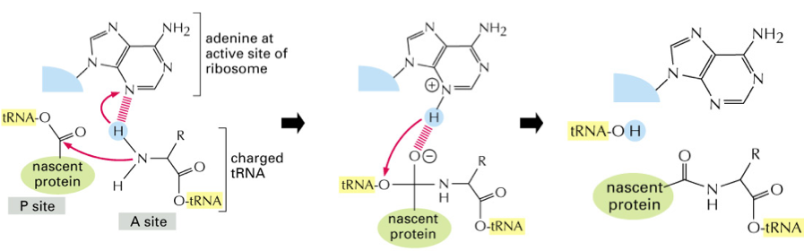 Adenine 2451 of the large rRNA catalyses the reaction. It withdraws a proton from the α-amino group of the residue in the A-site, allowing the N to attack the carboxyl group of the nascent protein in the P-site. The protonated A2451 donates the H to the P-site tRNA, releasing the tRNA from the nascent protein and returning adenine to its original chemical state.