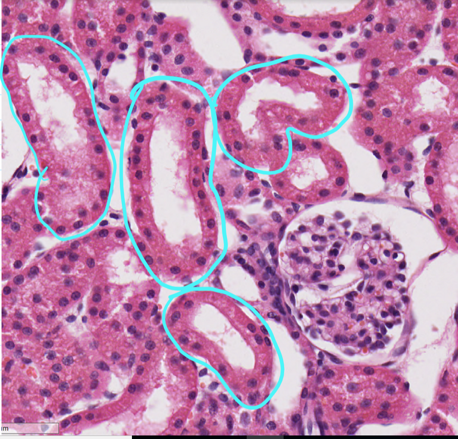 cuboidal epithelium, microvilli on the lumen, large basolaterally located nuclei, lots of mitochondria