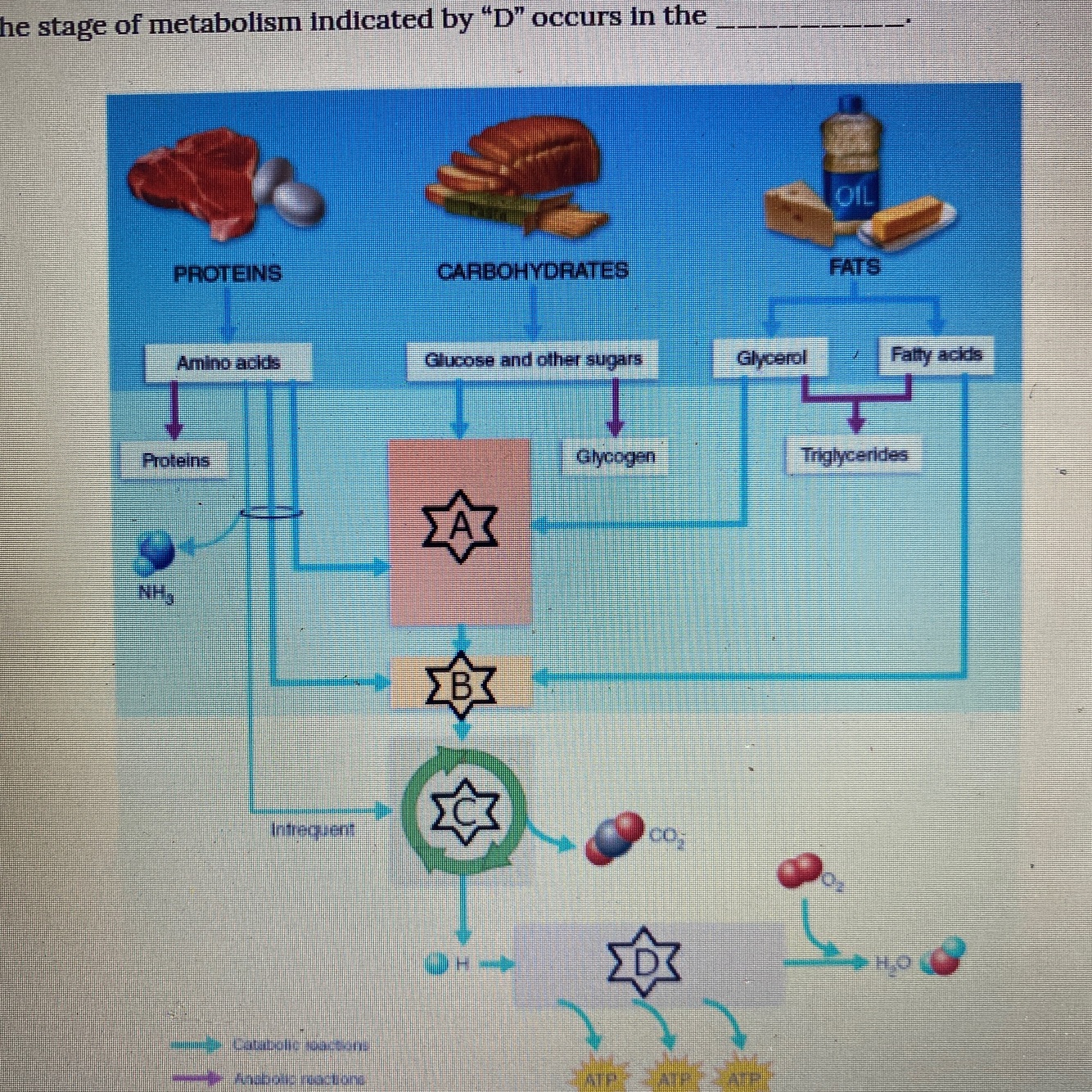 Where does the stage of metabolism indicated by D occur?