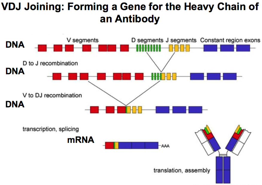 mechanism of genetic recombination that occurs only in developing lymphocytes during the early stages of T and B cell maturation. It involves somatic recombination, and results in the highly diverse repertoire of antibodies/immunoglobulins (Igs) and T cell receptors (TCRs) found on B cells and T cells, respectively. The process is a defining feature of the adaptive immune system