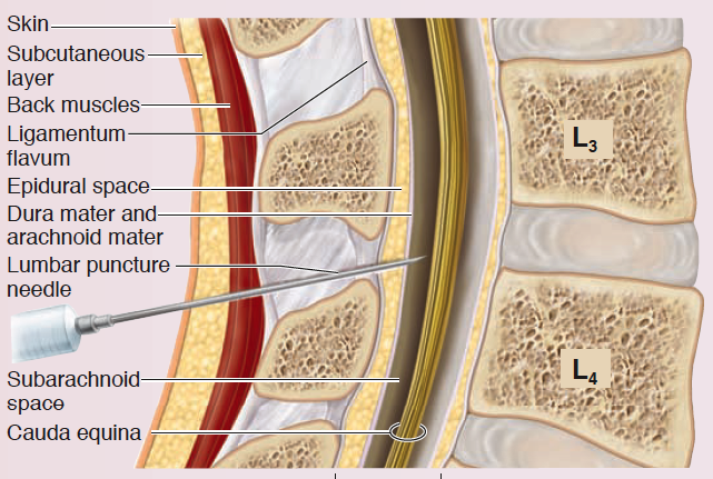The needle must be inserted through the skin, the subcutaneous layer, back muscles, and ligamentum flavum. Then, the needle must pass through the epidural space, dura mater, arachnoid mater, and enter the subarachnoid space. Here, approximately 3 to 9 milliliters of CSF are taken and then analyzed