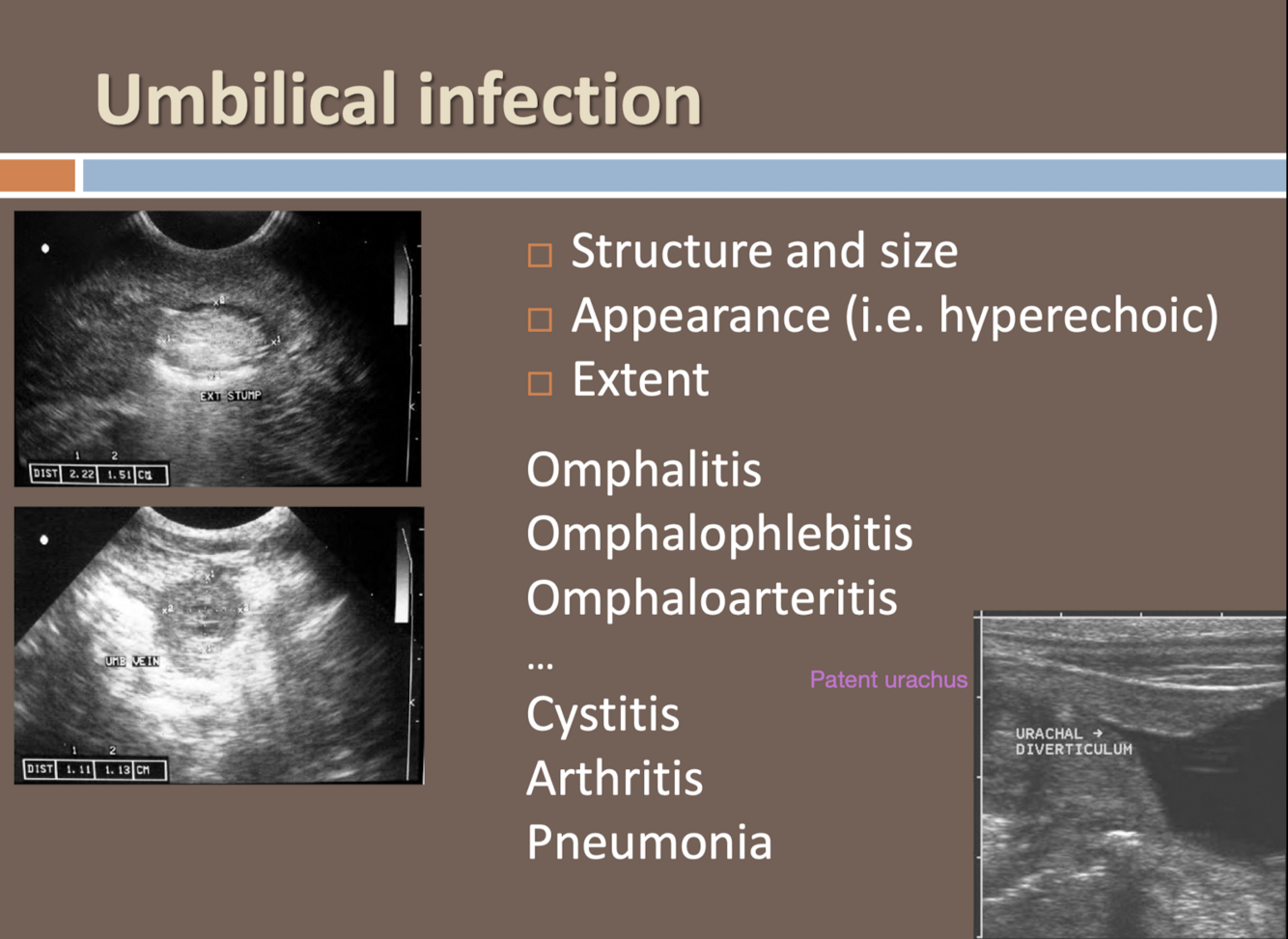 -Urachus, arteries, veins can be infected