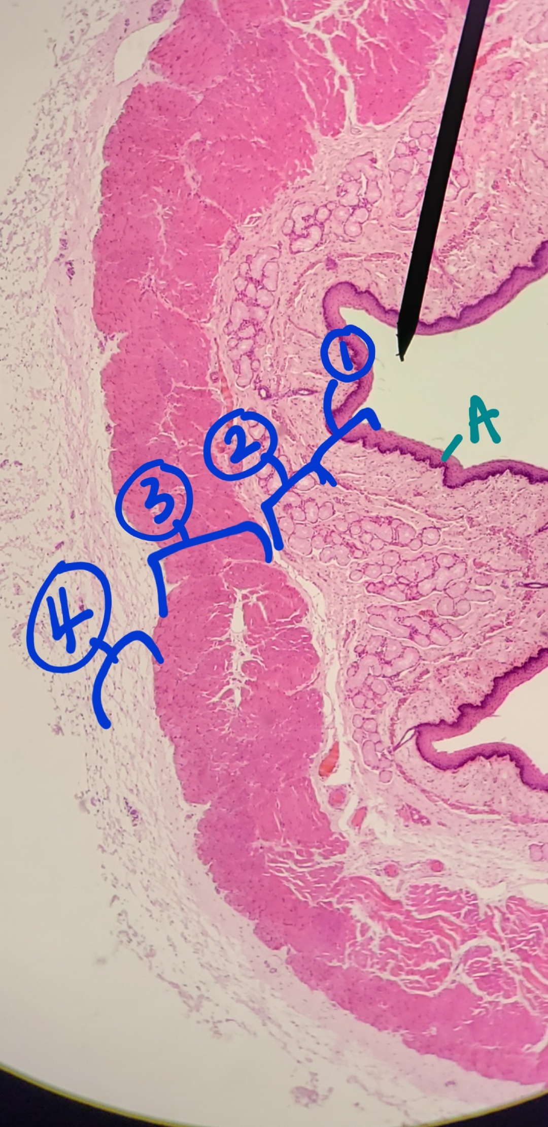 Esophagus 1. Tunica mucosa A. Stratified squamous epithelium 2. Tunica submucosa 3. Tunica muscularis 4. Tunica adventitia