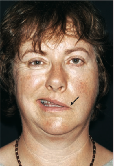 Facial nerve paralysis on the left side of the face. Note the drooping left side of the mouth (arrow) and the lack of contraction by the left orbicularis oculi when the woman tries to smile.