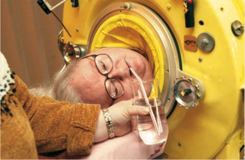 A patient in an iron lung due to diaphragm paralysis