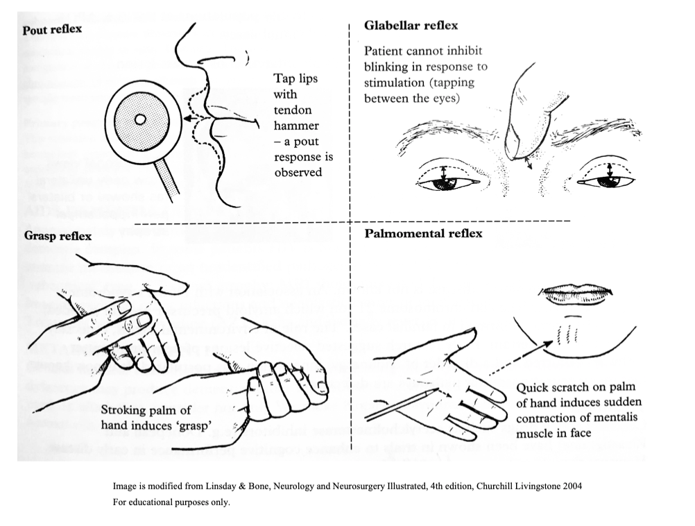 Affect (passive vs. engaged), look for disinhibition, witzelsucht, confabulation, utilization behavior, perserverance