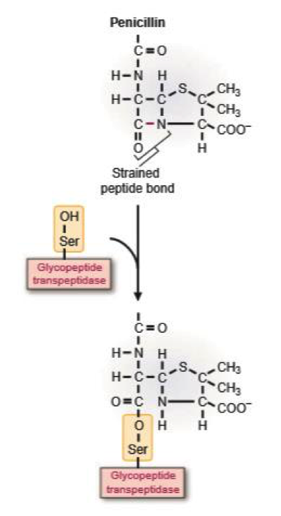 The antibiotic peniciliin is a transition state analog that binds tightly to glycopeptidyl transferase, the enzyme required by bacteria for synthesis of the cell wall.