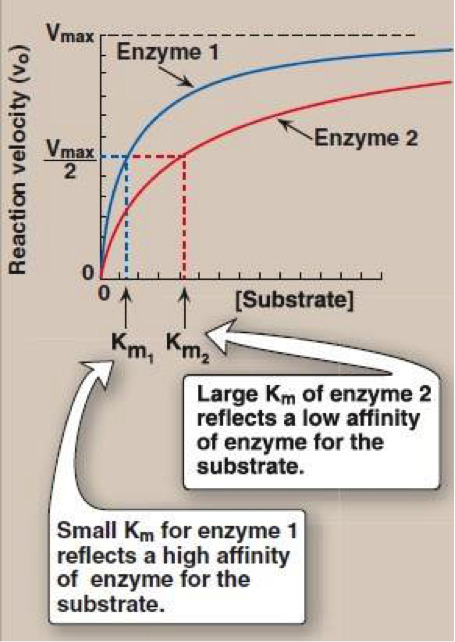 If we have a large Km, it means the enzyme affinity to the substrate is low. If we have a small Km it means the enzyme affinity to the subtrate is high.