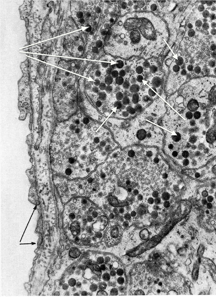 Label the structures indicated by the white arrows in this TEM section of the neurohypophysis