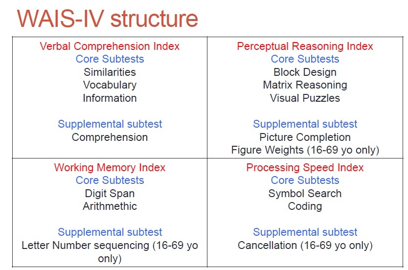 Describe the structure of the Wechsler Intelligence Scale for Adults Fourth Edition (WAIS-IV).