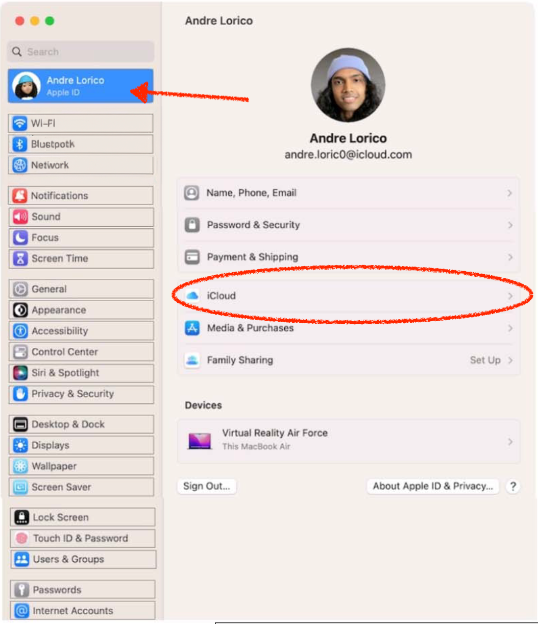Select the setting in the sidebar that Andre should turn on to access to iCIoud Drive on his Mac.