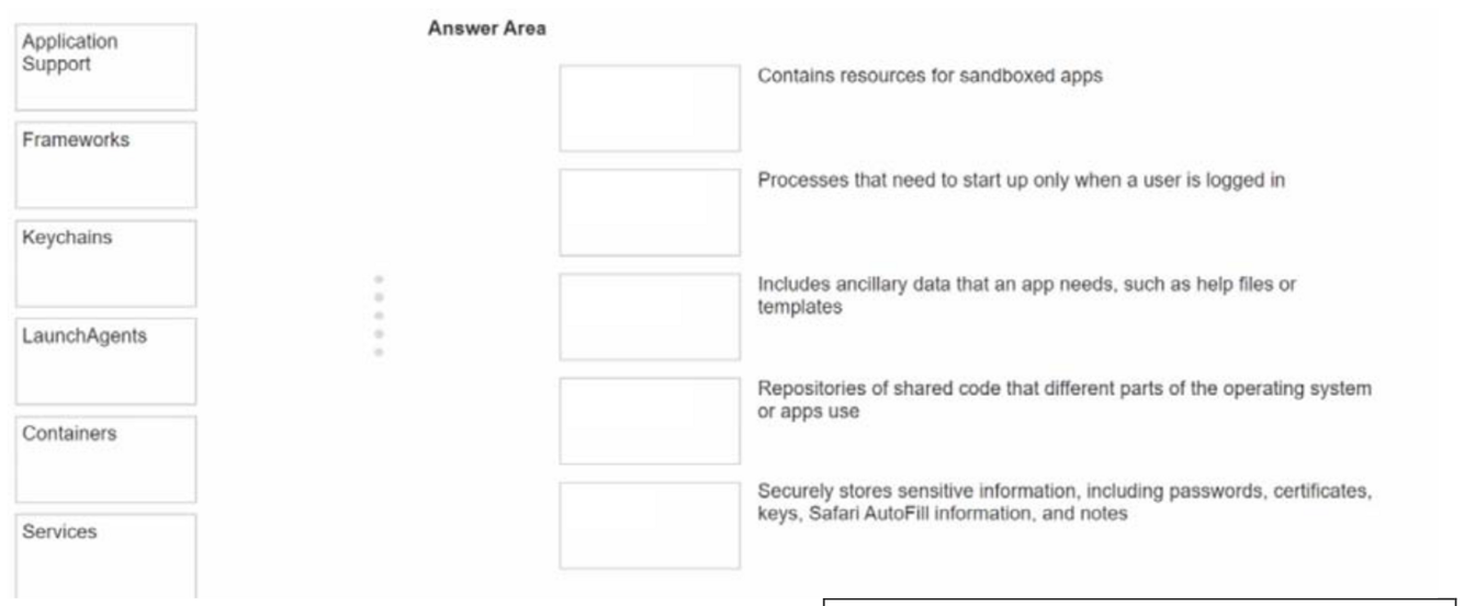 Match the macOS library resources listed on the left to the descriptions on the right by dragging responses to the correct target areas. Responses may be used once, more than once, or not at all.