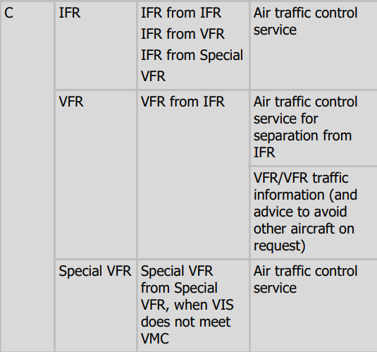 Type of Flight, Separation Provided and Service Provided in Class C Airspace ?