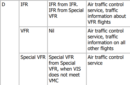 Type of Flight, Separation Provided and Service Provided in Class D Airspace ?