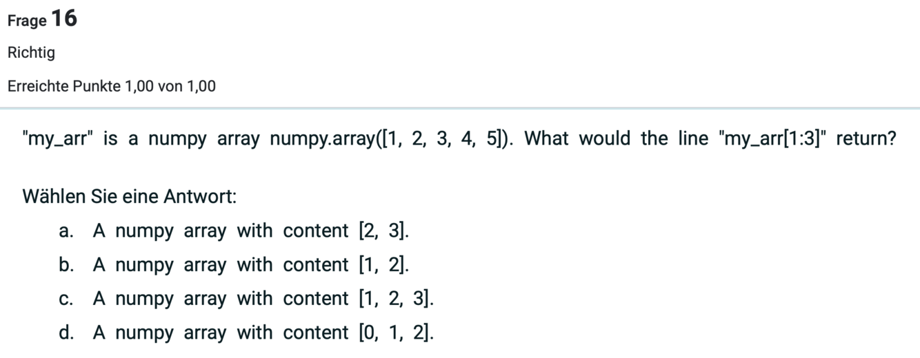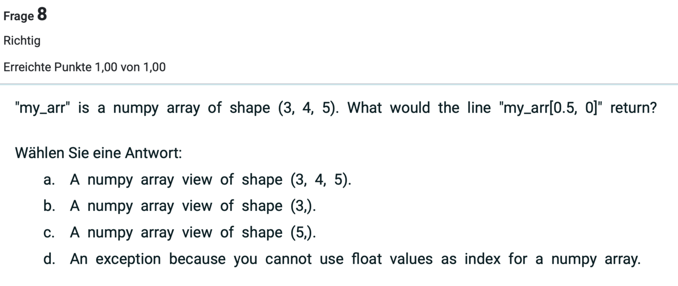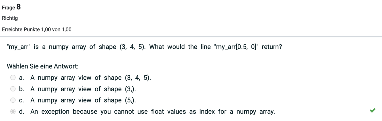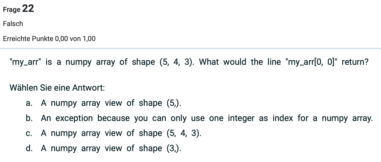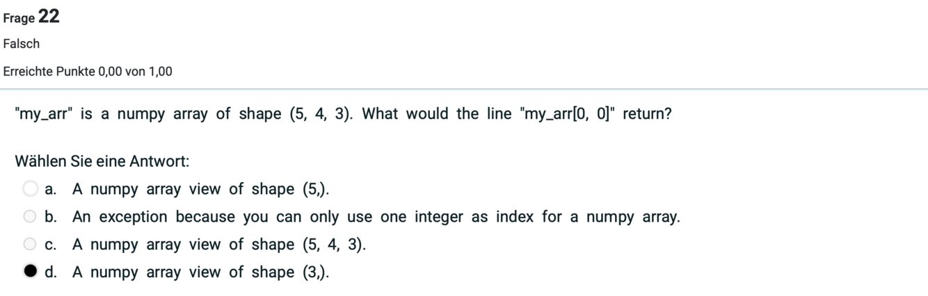 The line my_arr[0, 0] would select the first 1D array (of shape (3,)) from the 3D numpy array my_arr.