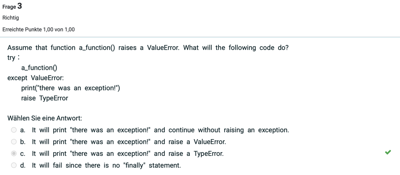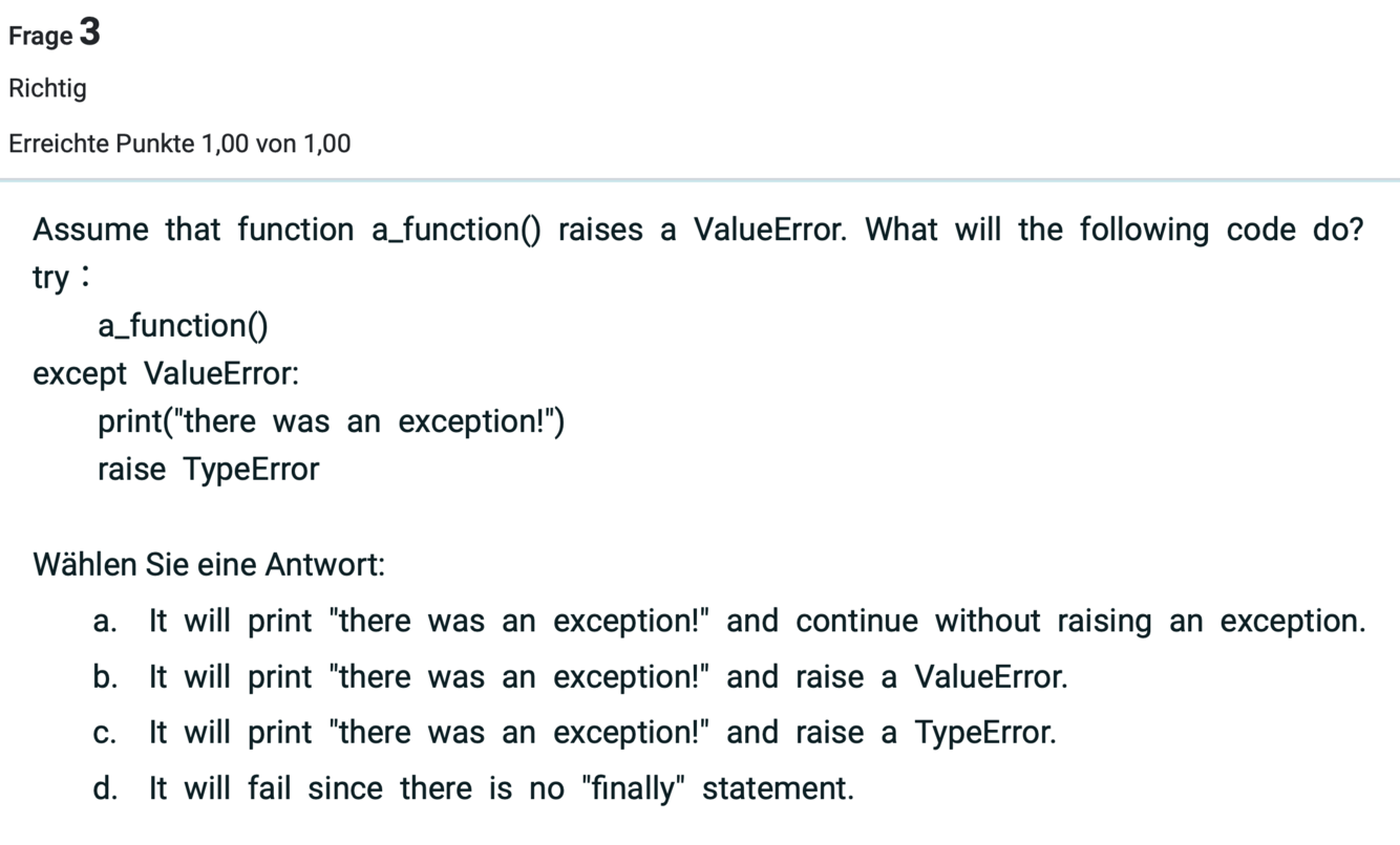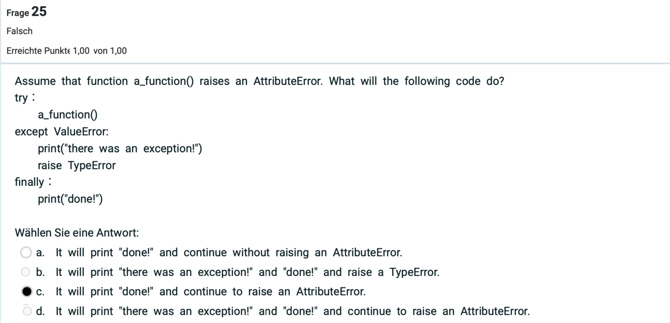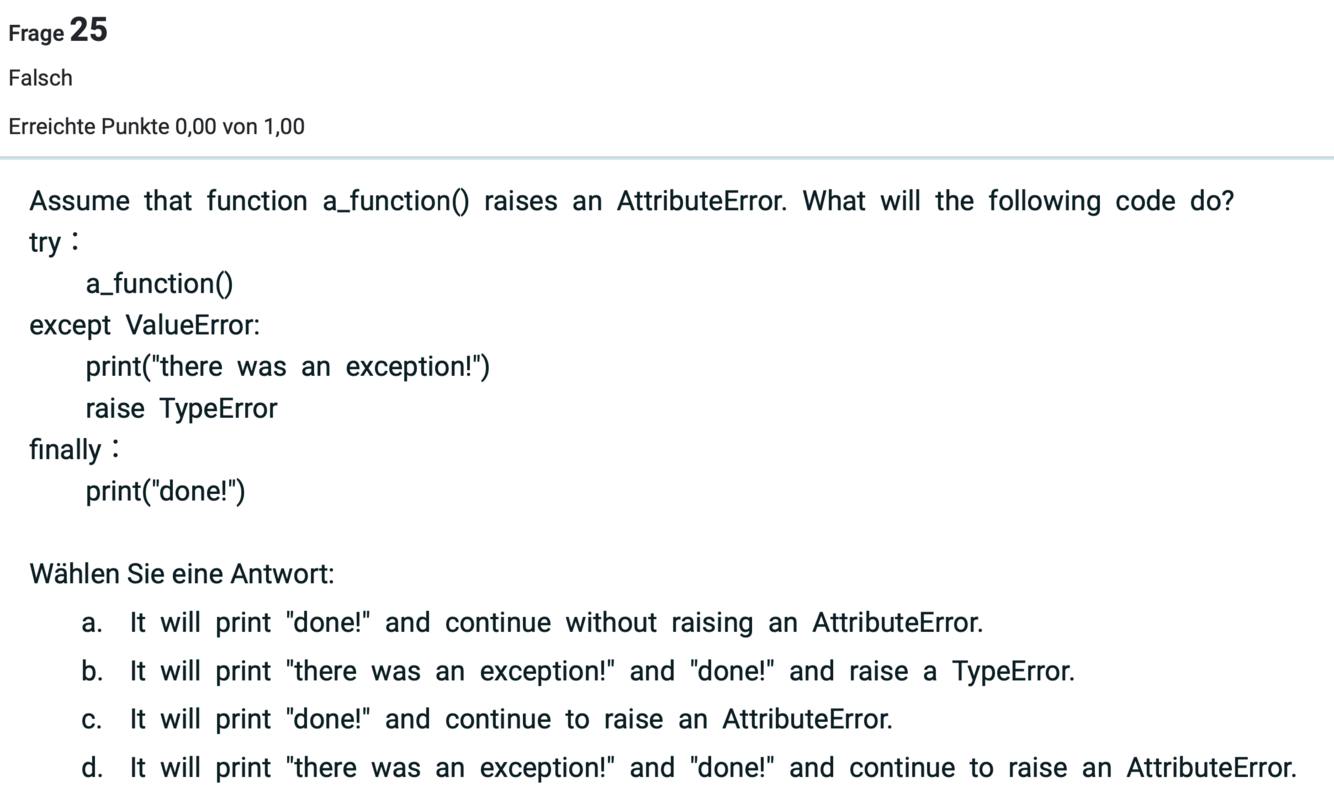 The AttributeError is raised but not caught by the except block because the except block is only looking for a ValueError. The finally block executes regardless of whether an exception was raised or not, and after the finally block executes, the AttributeError will propagate up the call stack.