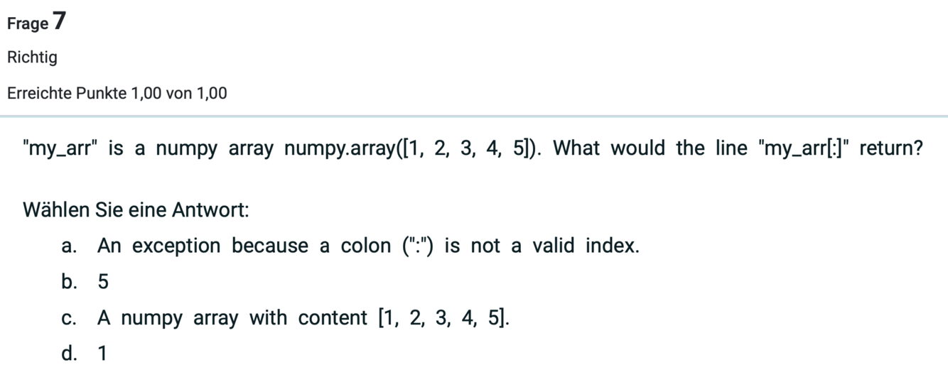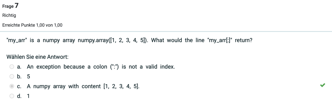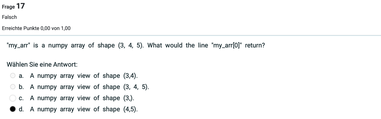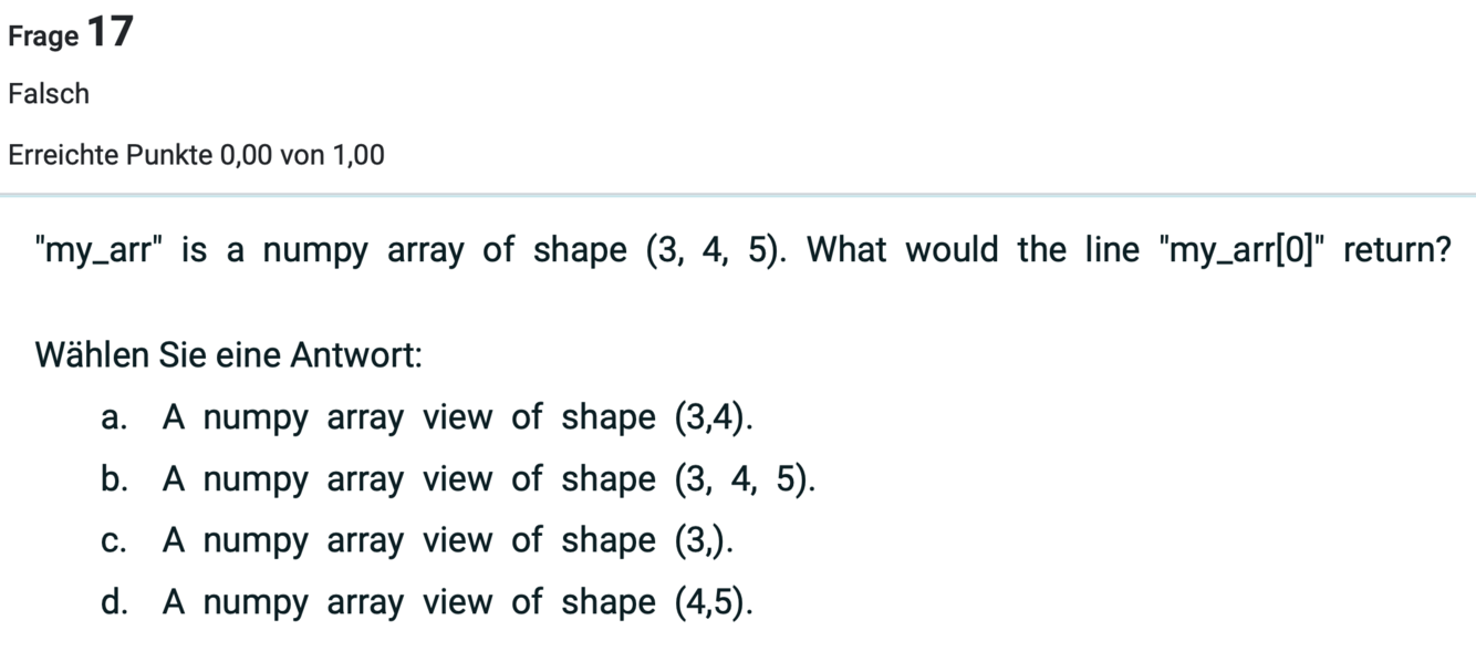 The line my_arr[0] would select the first 2D array (of shape (4, 5)) from the 3D numpy array my_arr.