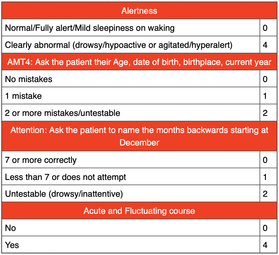 The 4AT is a validated tool that is quick to complete and easy to use in most clinical settings. It incorporates a short version of the abbreviated mental test score (AMTS)
