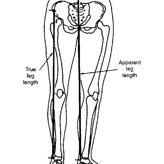 How do you measure true-leg length in a hip examination?
