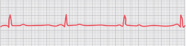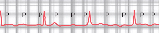 There are several P waves present without a QRS segment. This means that the electrical activity generated from the SA node is not reaching the ventricle. This is characteristic of an AV block