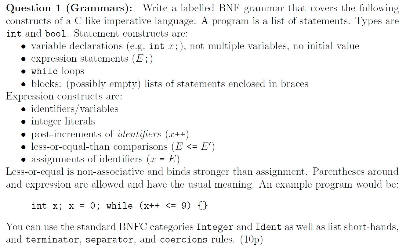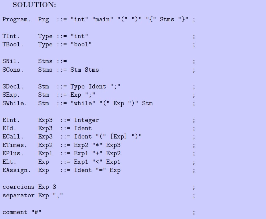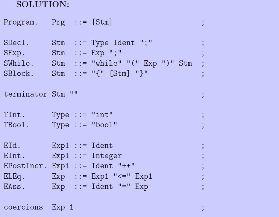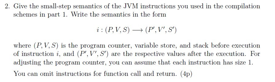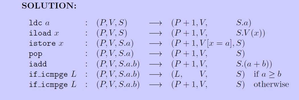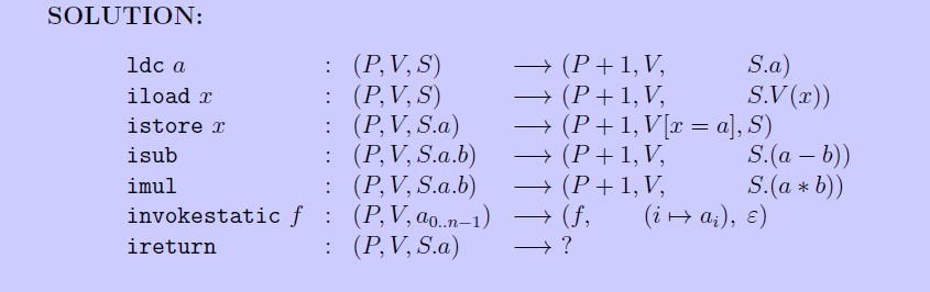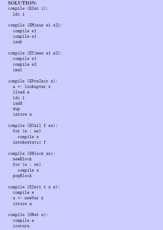 Write compilation schemes in pseudo-code for each of the grammer constructions in. The compiler shoul output symbolic JVM instructions (i.e Jasmin assembler). It is not necessary to remember exactly the ames of the instructions - only what arguments they take and how they work.