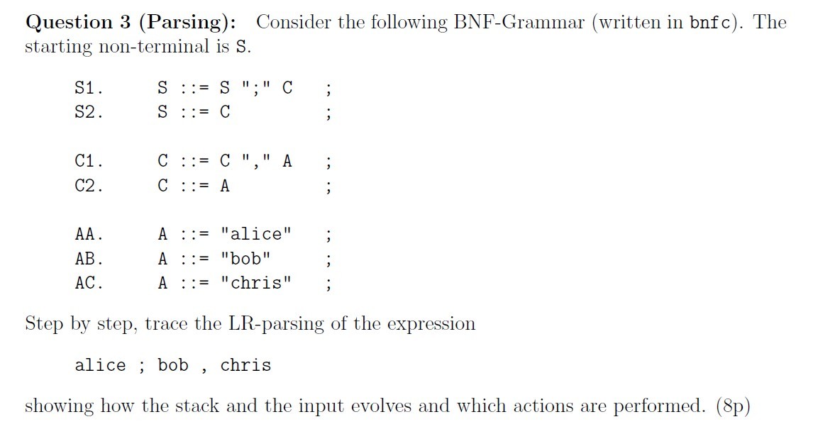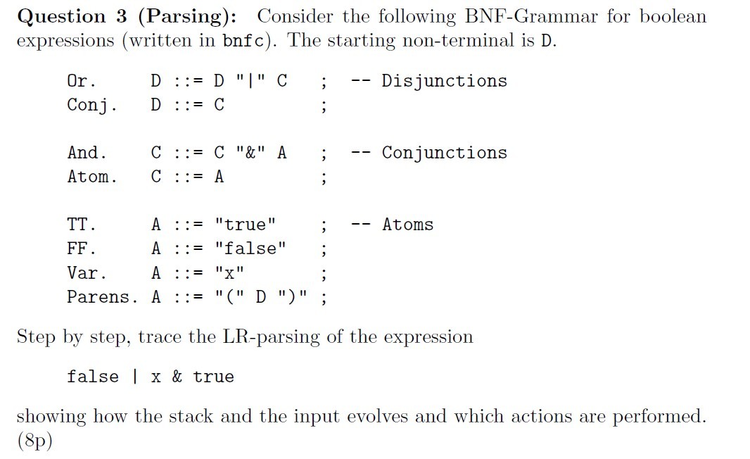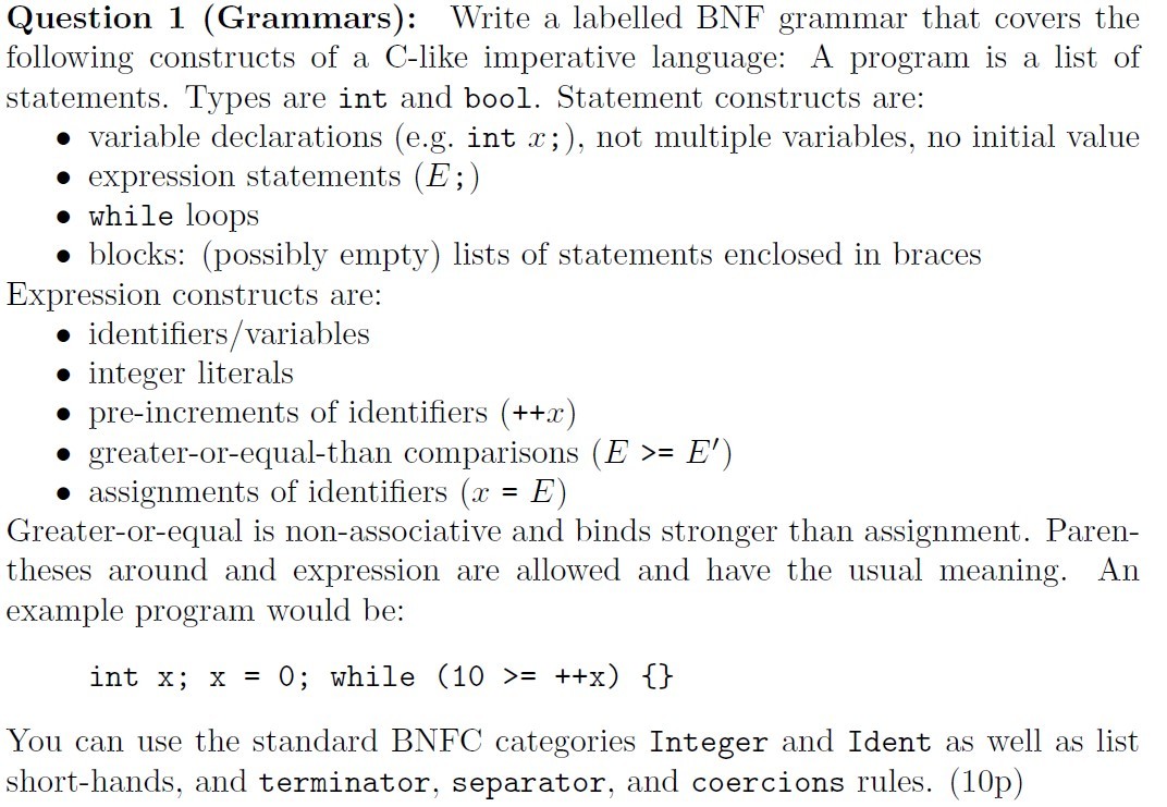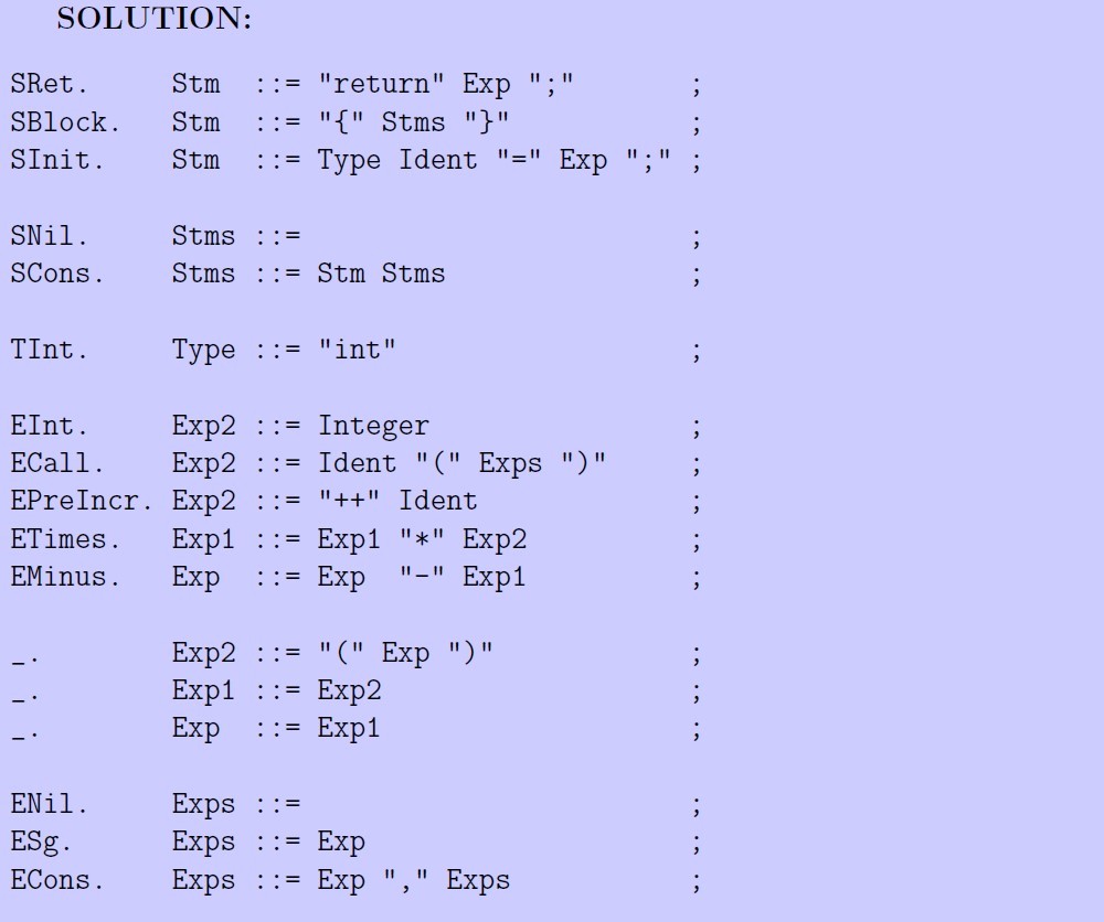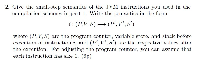 Write compilation schemes in pseudo-code for each of the grammer constructions in. The compiler shoul output symbolic JVM instructions (i.e Jasmin assembler). It is not necessary to remember exactly the ames of the instructions - only what arguments they take and how they work.