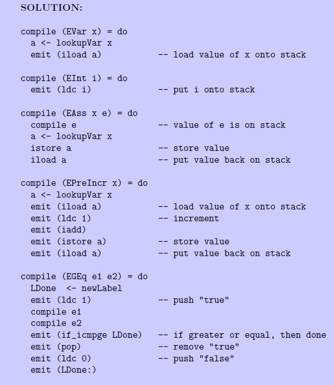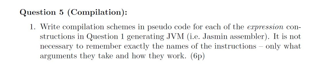 Write compilation schmes in pseudo code for each of the expression constructions above generating JVM (i. asmin assembler). It is not necessary to remember exactly the names of the instructions - only what arguments they take and how they work.