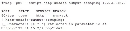 The security team reviews a web server for XSS and runs the following Nmap scan: