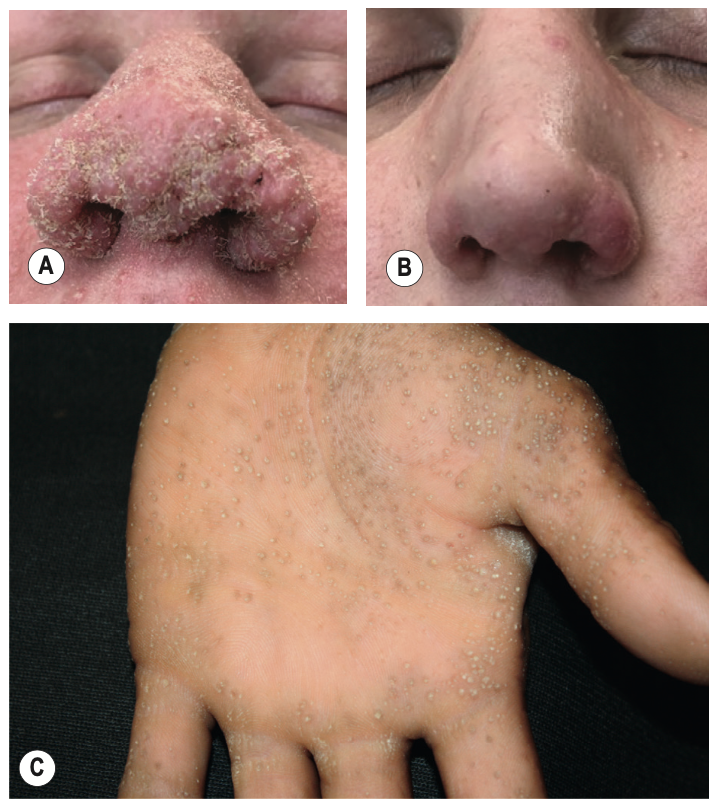 or discontinuation of immunosuppressive medications, and successful treatment with topical cidofovir, oral valganciclovir, and leflunomide has been described. Trichodysplasia spinulosa-like hyperkeratosis has also been described in a patient with basal cell nevus syndrome treated with vismodegib